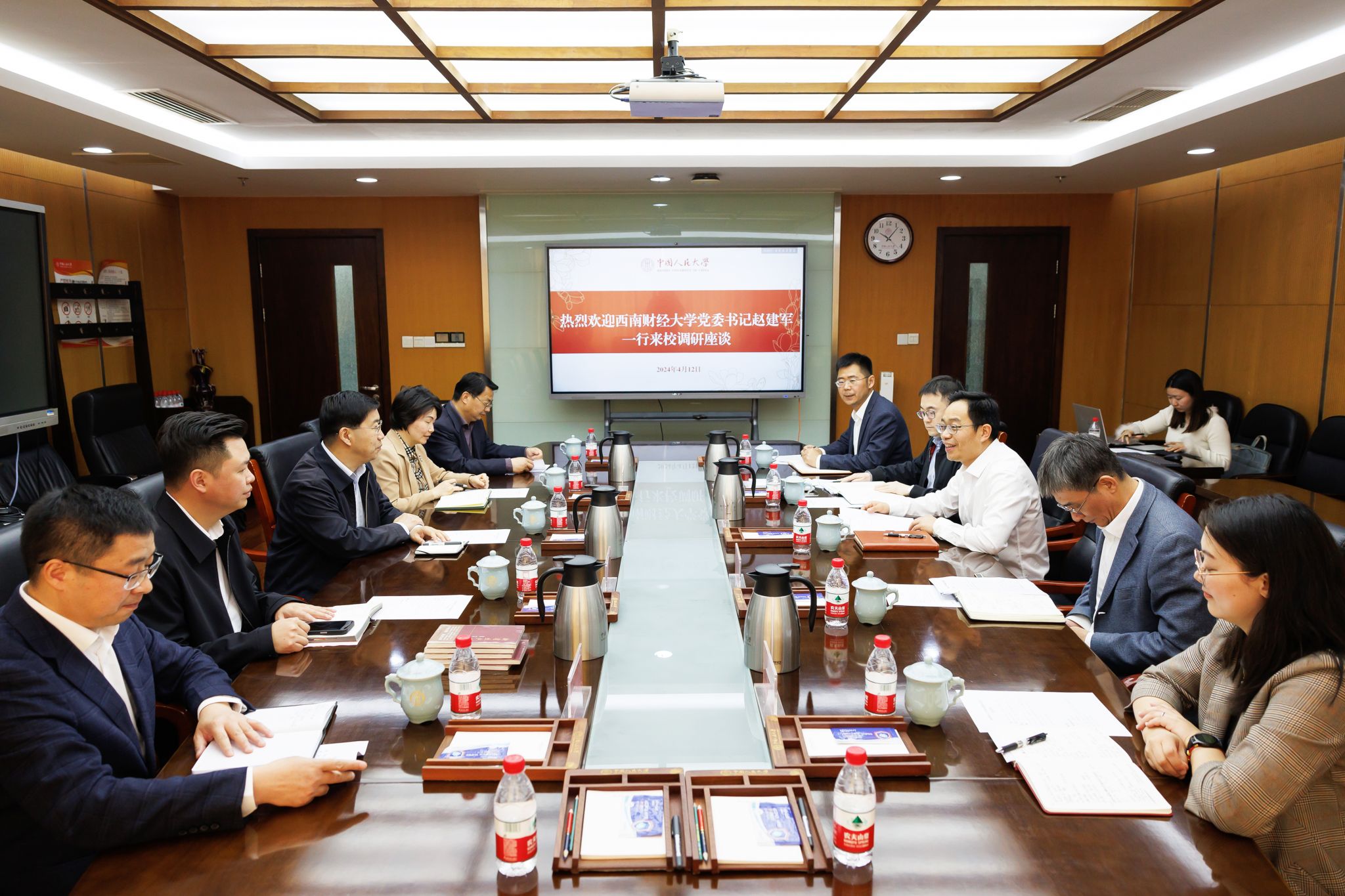 在中国人民大学交流时,张东刚对我校一行的到来表示欢迎,并简要介绍了中国人民大学的历史沿革和学校发展情况。他表示,中国人民大学坚持“党办的大学让党放心、人民的大学不负人民”办学理念,与西南财经大学“经世济民、孜孜以求”的办学使命相互契合;希望两校在良好的合作基础之上,未来在高层次人才和干部交流、研究生培养、人文学科建设等方面深化务实合作,共同答好时代发展的重大命题。赵建军表示,中国人民大学是“我国人文社会科学高等教育领域的一面旗帜”,学校始终坚持扎根中国大地办大学,在长期的办学实践中,为党和国家事业发展培养了大批优秀人才。中国人民大学在学科建设、人才队伍建设、人才培养等方面拥有丰富经验,为我校提供了很好的借鉴,希望双方进一步加强沟通交流,深化学科建设、人才培养、科研等领域合作,携手建设中国特色世界一流大学。
