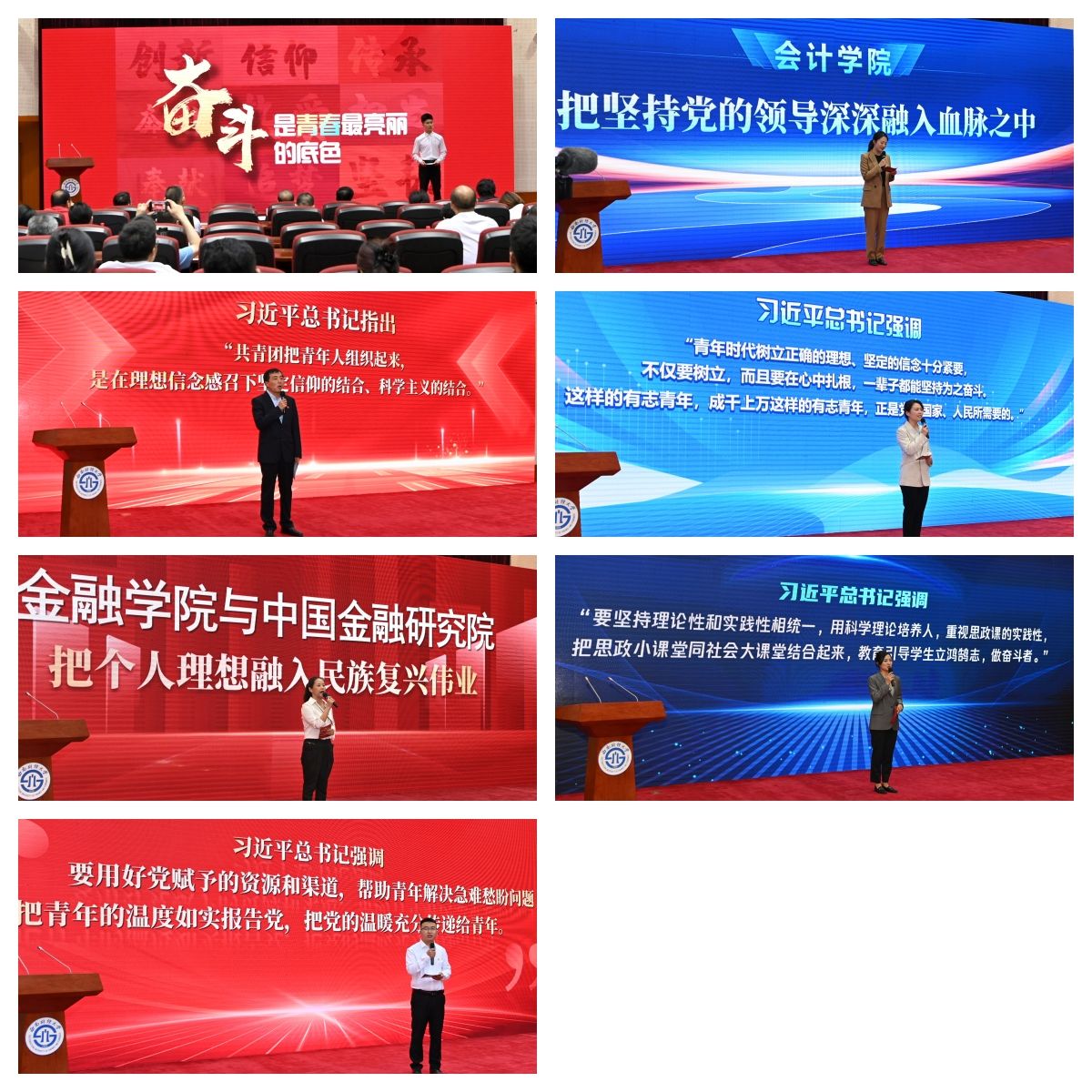 获奖优秀青年学生杜在林和学校青年工作者代表王慧、王磊、牛晓晶、杨倩、李思雨、刘华发言,依次向党汇报了广大西财青年挺膺担当、砥砺前行的先进事迹,从坚持党建带团建、传递信仰力量、服务金融强国建设、当好桥梁纽带、强化实践育人、培育时代新人等方面,生动展现了各级团组织在党的坚强领导下,不忘初心、牢记使命,走在青年前列,勇立改革潮头,在建设金融强国、教育强国新征程中的西财青春作为。
