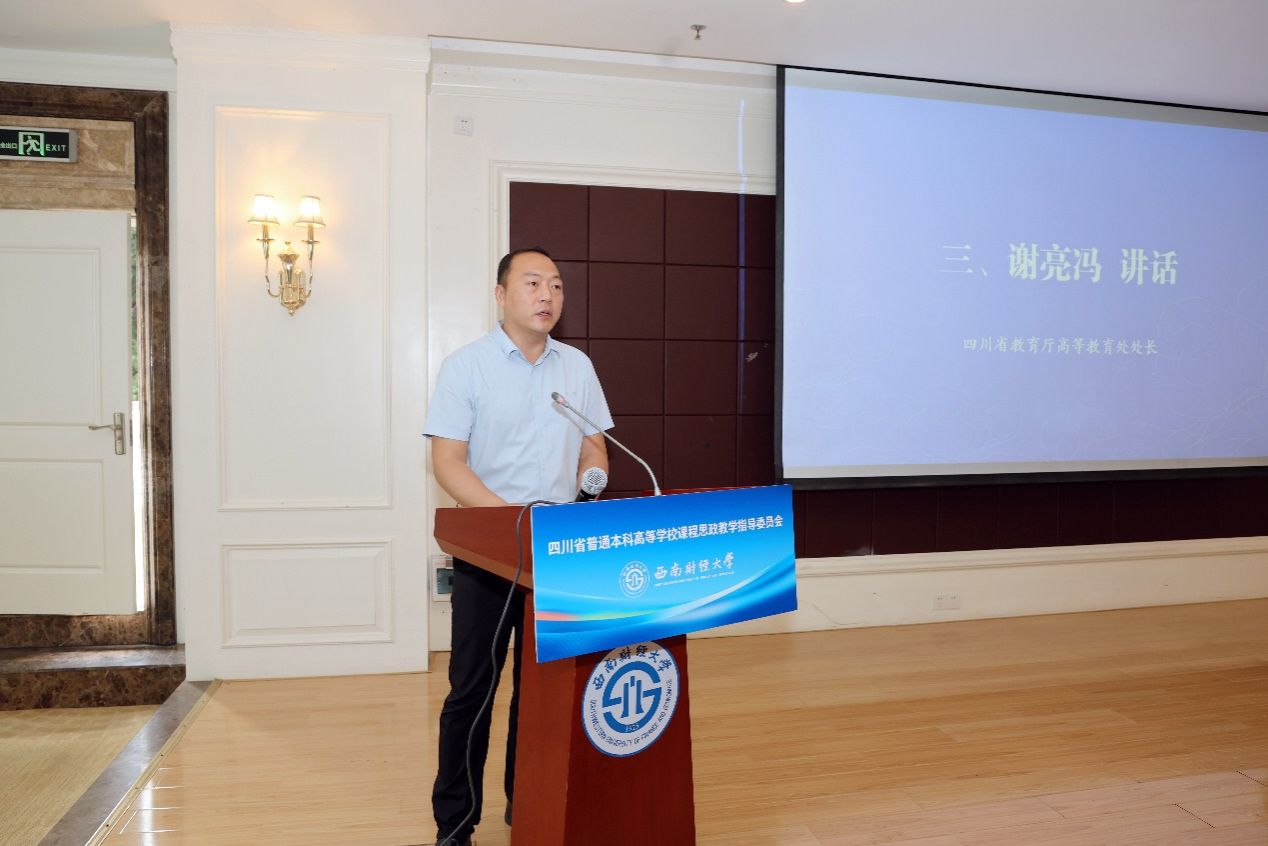 谢亮冯在讲话中简要回顾了四川省高校课程思政建设工作并阐释了教指委成立的重要意义。他指出,落实立德树人根本任务,建设高水平人才培养体系,必须抓好课程思政建设,将价值塑造、知识传授和能力培养融为一体,抓住教师队伍“主力军”、课程建设“主战场”、课堂教学“主渠道”,让高校各类课程与思政课程同向同行,构建全员全程全方位育人大格局。近年来四川省教育厅通过开展“课程思政百千万工程”,在全国率先开展课程思政示范项目建设,形成了“校校有精品、门门有思政、课课有特色、人人重育人”的良好局面。他强调,课程思政教指委要坚定以习近平新时代中国特色社会主义思想为指导,积极发挥研究、咨询、指导、评价、服务等作用,特别是在课程思政优质资源数字化转化上发挥积极作用,主动发出“四川声音”,提供“四川方案”。