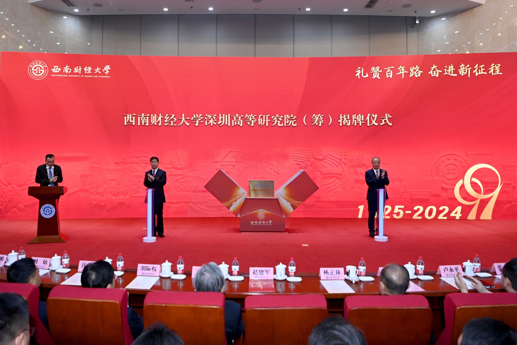 赵建军、李永强共同揭幕西南财经大学百年校庆标识,并为西南财经大学深圳高等研究院(筹)揭牌。