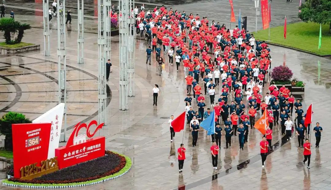 仪式前,学校校领导、中层干部代表、离退休老同志代表、师生代表、校友代表等分别在光华柳林两校区,伴着清晨微雨、循着西财足迹,在熟悉的校园道路上向前奔跑,一起重温西财99载岁月春秋的恢弘历程,在回顾、致敬和展望中,共同奏响喜迎百年的华丽乐章。