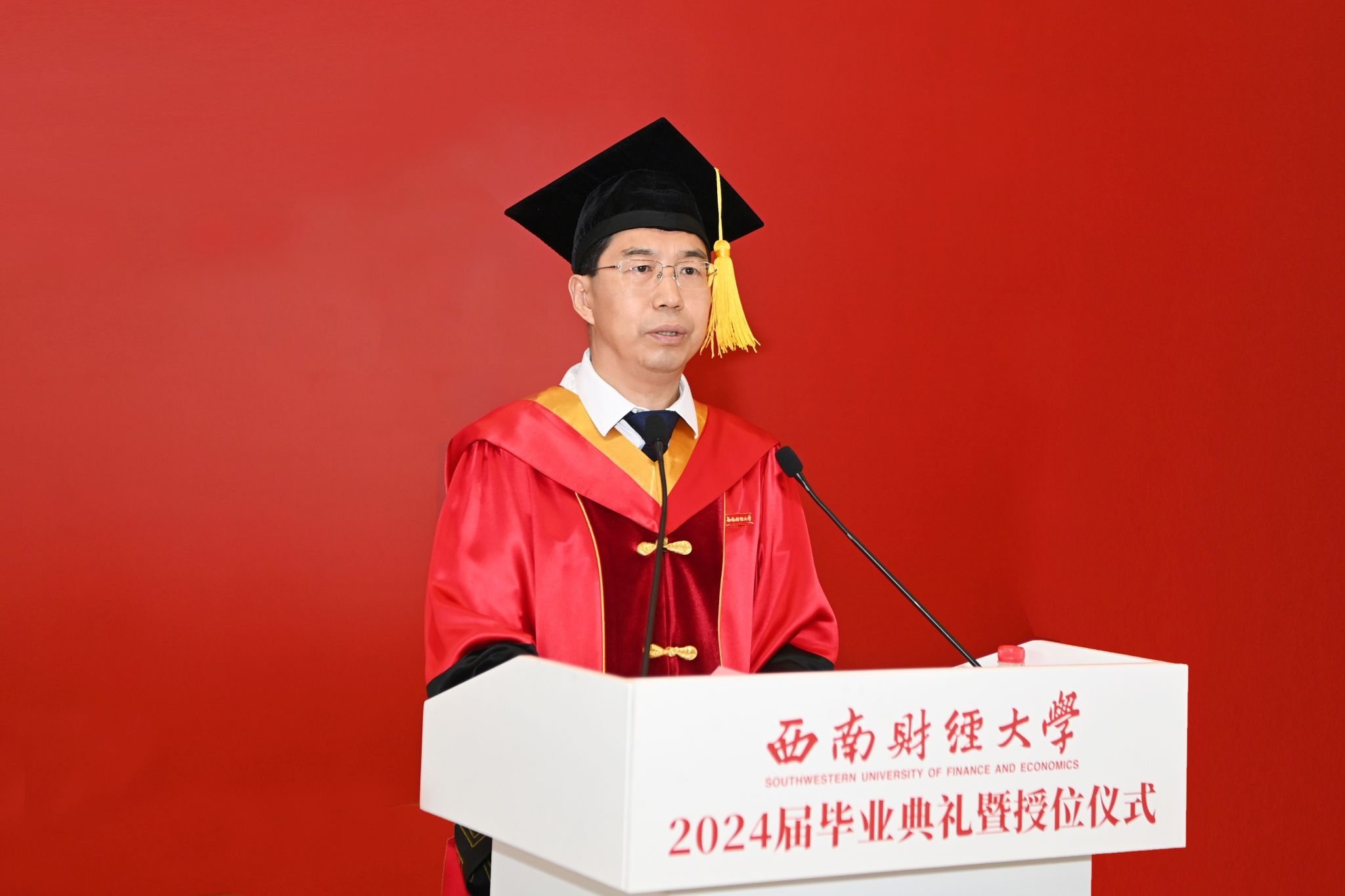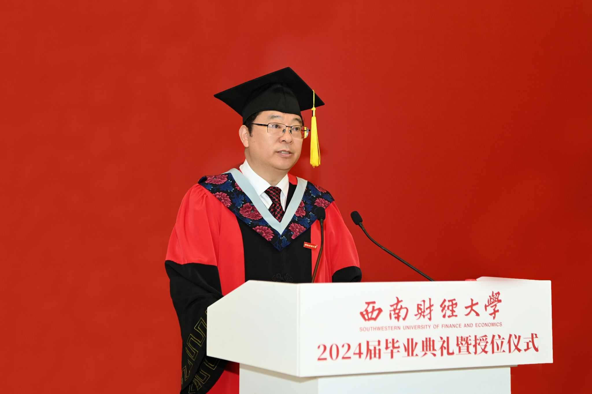 赵建军主持典礼时指出,“经世济民、孜孜以求”的西财精神,既蕴含着一所大学“教育报国”的崇高使命,又饱含着全体师生“爱国奉献”的信念追求,还彰显着财经学科的底蕴特色,是每一名西财人奋进拼搏的思想源泉和不竭动力。他深情勉励毕业生在今后的人生之路上传承好西财精神,做行动派、当实干家,在强国建设、民族复兴伟业中贡献西财青春力量。赵建军寄语西财青年,要树立“经世报国”的远大志向,以理想为帆、奋斗为桨,坚定不移听党话、跟党走,把准人生方向,积极投身强国建设、民族复兴伟业,在“强国有我”的实践中不断提高本领能力,自觉在以中国式现代化全面推进中华民族伟大复兴的崭新征程中挺膺担当。要厚植“济民安邦”的为民情怀,涵养“我将无我”的境界、扛牢“不负人民”的责任,坚持人民至上,在工作岗位上深入基层、深入群众,既向人民群众学习,更解决他们的急难愁盼问题,自觉做到民之所忧,我必念之;民之所盼,我必行之。要锤炼“孜孜以求”的坚韧品格,以奔腾不息的动力、上下求索的毅力,干一行、爱一行、钻一行,勇于做先锋、当闯将,在急难险重中强壮筋骨,在摸爬滚打中增长才干,迎难而上、艰苦奋斗、坚韧不拔,一步一个脚印,在新时代新征程上留下无悔的青春足迹。