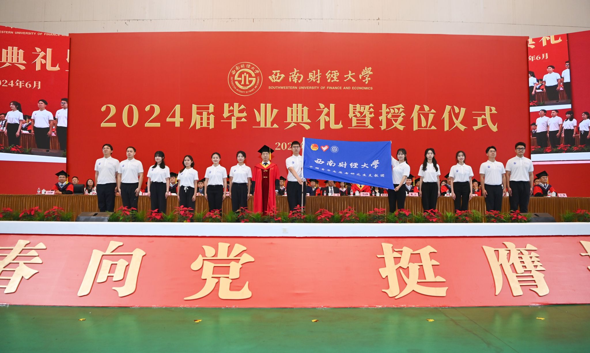 全场毕业生高举右拳齐声宣誓:将传承西财精神、发扬西财校训,坚定理想信念、锤炼过硬本领、肩负社会责任、担当时代使命,让青春在祖国和人民最需要的地方绽放,为中华民族伟大复兴和人类文明共同进步贡献力量。