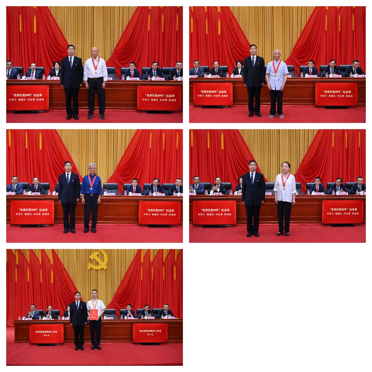 赵建军为刘明才、谢建民、任治君、段海燕四位老党员颁发“光荣在党50年”纪念章,为四川省优秀党务工作者韩文龙颁发证书。