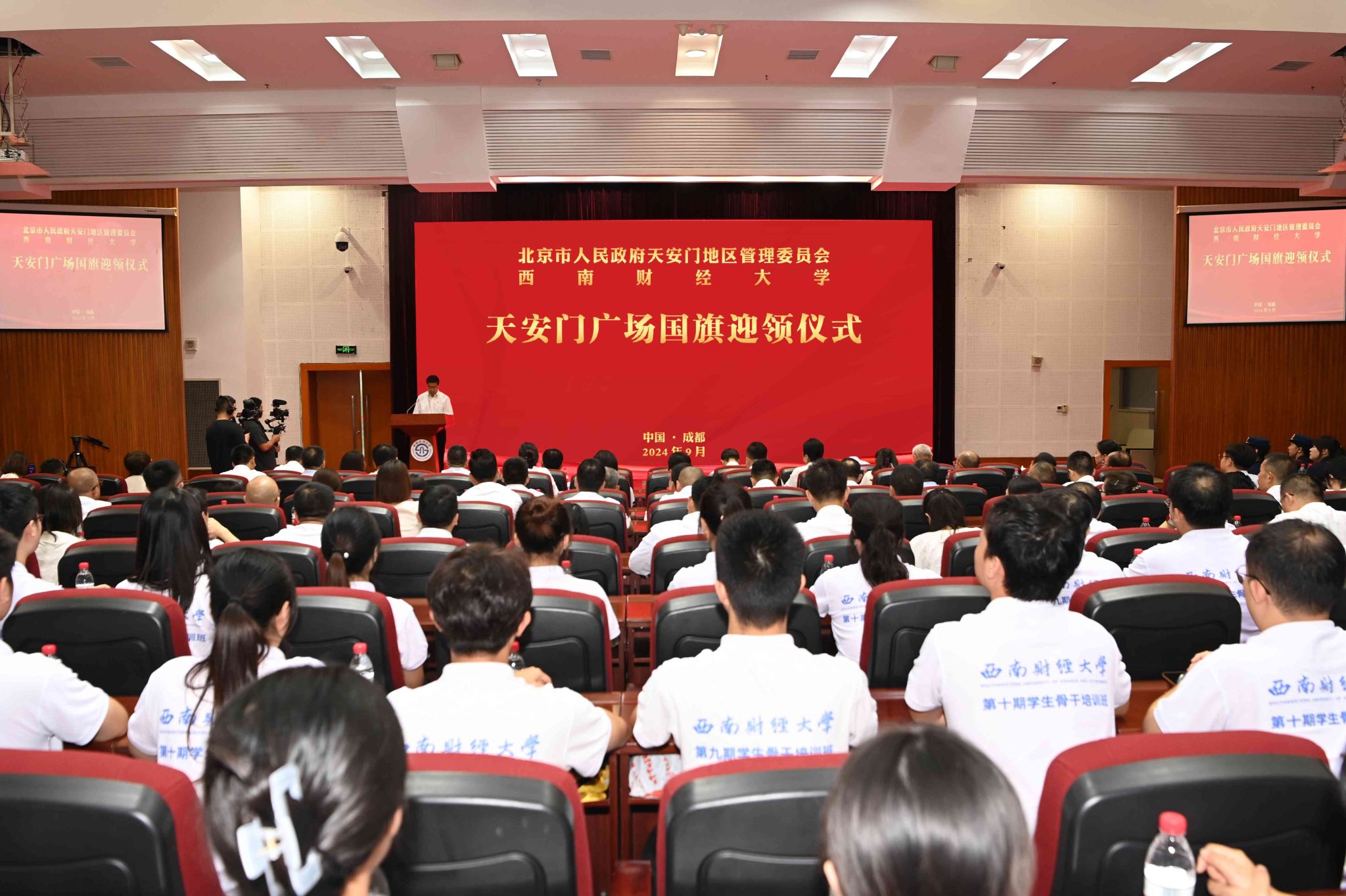 9月7日,西南财经大学在柳林校区腾骧楼137会议室举行庄重仪式,迎领天安门广场国旗。天安门地区管理委员会党组成员、副主任(正局长级)姚辉和相关负责人、干部;学校党委书记赵建军,党委原副书记、百年校庆筹备工作办公室常务副主任曾道荣,党委副书记明海峰,党委常委、副校长马永强和相关职能部门负责人、各学院(研究院)负责人、师生代表、国旗班成员等参加仪式。姚辉、赵建军分别致辞。马永强主持仪式。