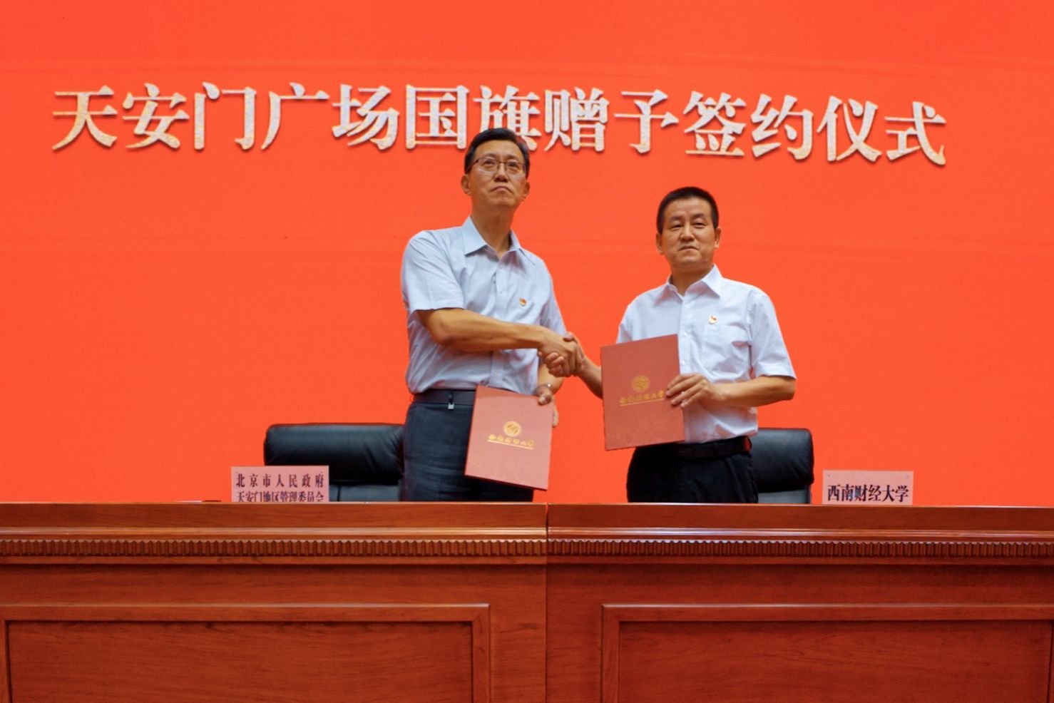 赵建军代表学校党委向天安门地区管理委员会表示热烈欢迎和诚挚感谢。他指出,每一面国旗都承载着无数先辈的奋斗与牺牲,凝聚着全体中国人民的爱国情怀和共同理想。这面国旗是西南财大的宝贵财富,是全校师生的共同荣誉,西财人倍感无上光荣、无尽荣耀,深感责任重大、使命重大。他强调,要在国旗指引下赓续红色基因、厚植爱国情怀,铸牢教育忠诚、勇担育人使命,凝聚奋进力量、谱写发展新篇,加快建设财经特色鲜明的世界一流大学,以实际行动和优异成绩献礼百年西财、服务强国建设。