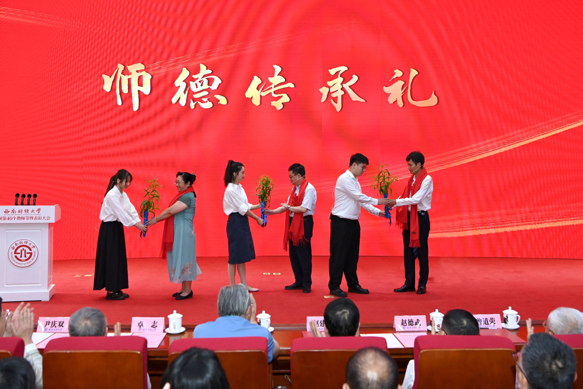 春风化雨育桃李,寒暑更迭志不渝。大会举行“桃李传志”师德传承礼,获奖教师代表林义、荣休教师代表盛敏、从教30年教职工代表罗松涛,回顾坚守岗位育人育才、见证西财岁月变迁的经历感悟,由衷祝愿学校后浪奔涌、薪火传承,在一辈辈西财人接力中,从辉煌走向新的辉煌。新入职教师代表黄佐毅、黄子航、李拓航表示将以赤子之心传承老一辈西财人“择一事、终一生”的信念,践行和弘扬教育家精神,潜心教书育人,勇攀学术高峰,奋力书写人才自主培养、科技自立自强的时代答卷。
