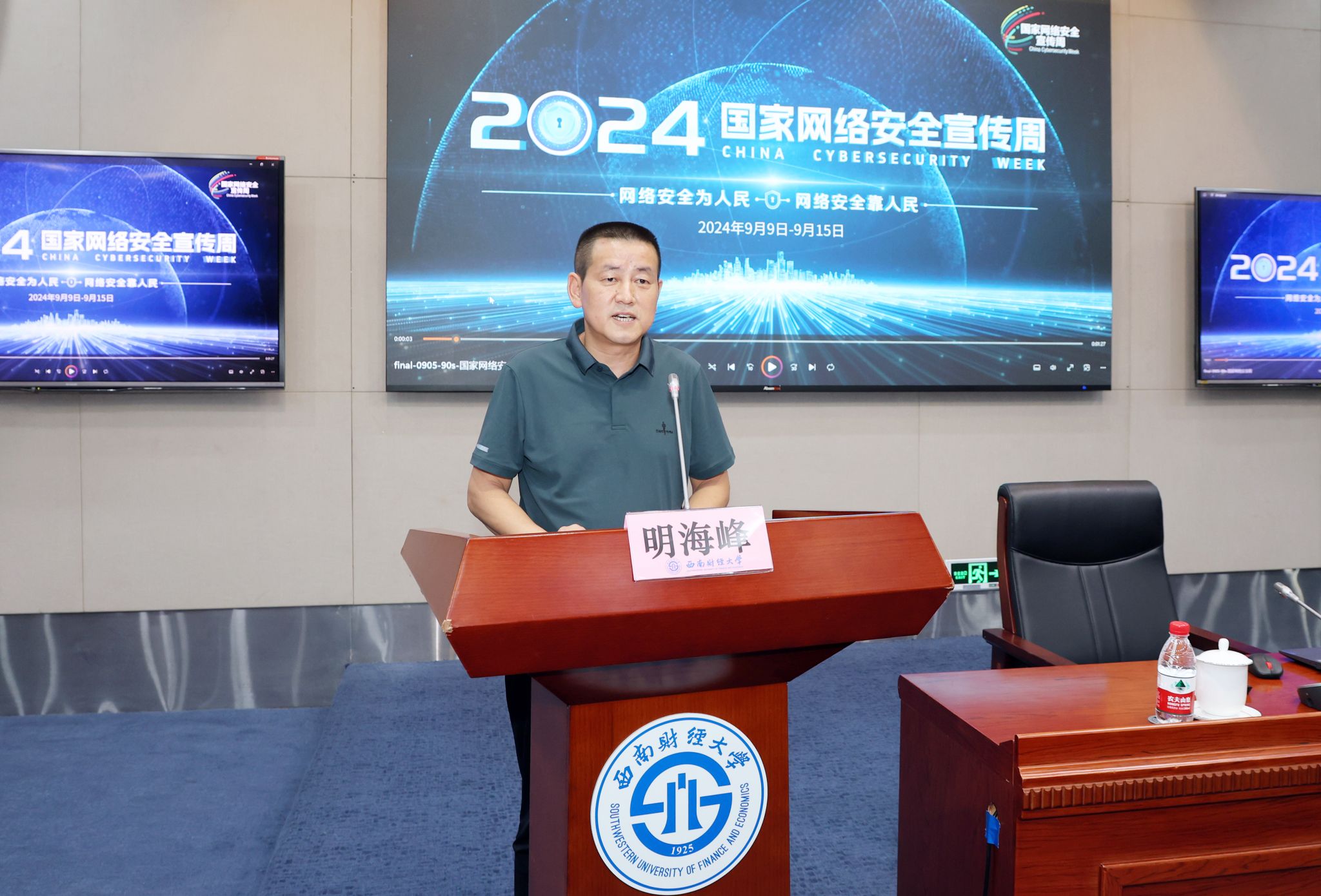 明海峰指出,2024年是习近平总书记提出网络强国战略目标十周年,也是习近平总书记提出总体国家安全观十周年,要坚持以习近平总书记关于网络强国的重要思想统揽学校网络安全工作全局,牢固树立总体国家安全观,统筹发展和安全,严格落实网络安全责任制,切实筑牢网络安全屏障。他围绕具体工作提出要求,要提高政治站位,牢牢把握网信工作的政治属性,有力维护意识形态安全和网络安全;要聚焦一流大学建设目标,加强形势分析研判,营造网络空间安全环境;要把握发展规律,推动信息赋能,坚定不移推进教育数字化行动;要强化协同联动,打造数据基座,加快数字西财建设。