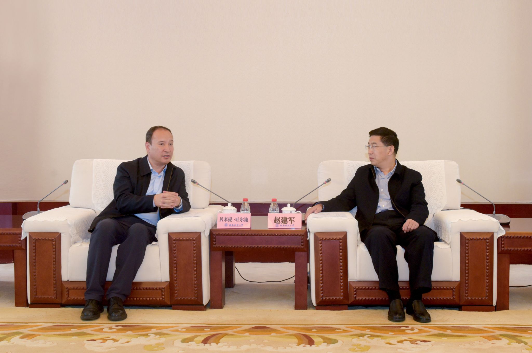 赵建军对居来提·吐尔地一行来访表示热烈欢迎,并简要介绍了西南财经大学的发展情况。他表示,学校党委高度重视援疆工作,两校同为西部地区财经类高校,希望双方持续加强联系,携手并进,共同为西部地区发展贡献财经高校力量。