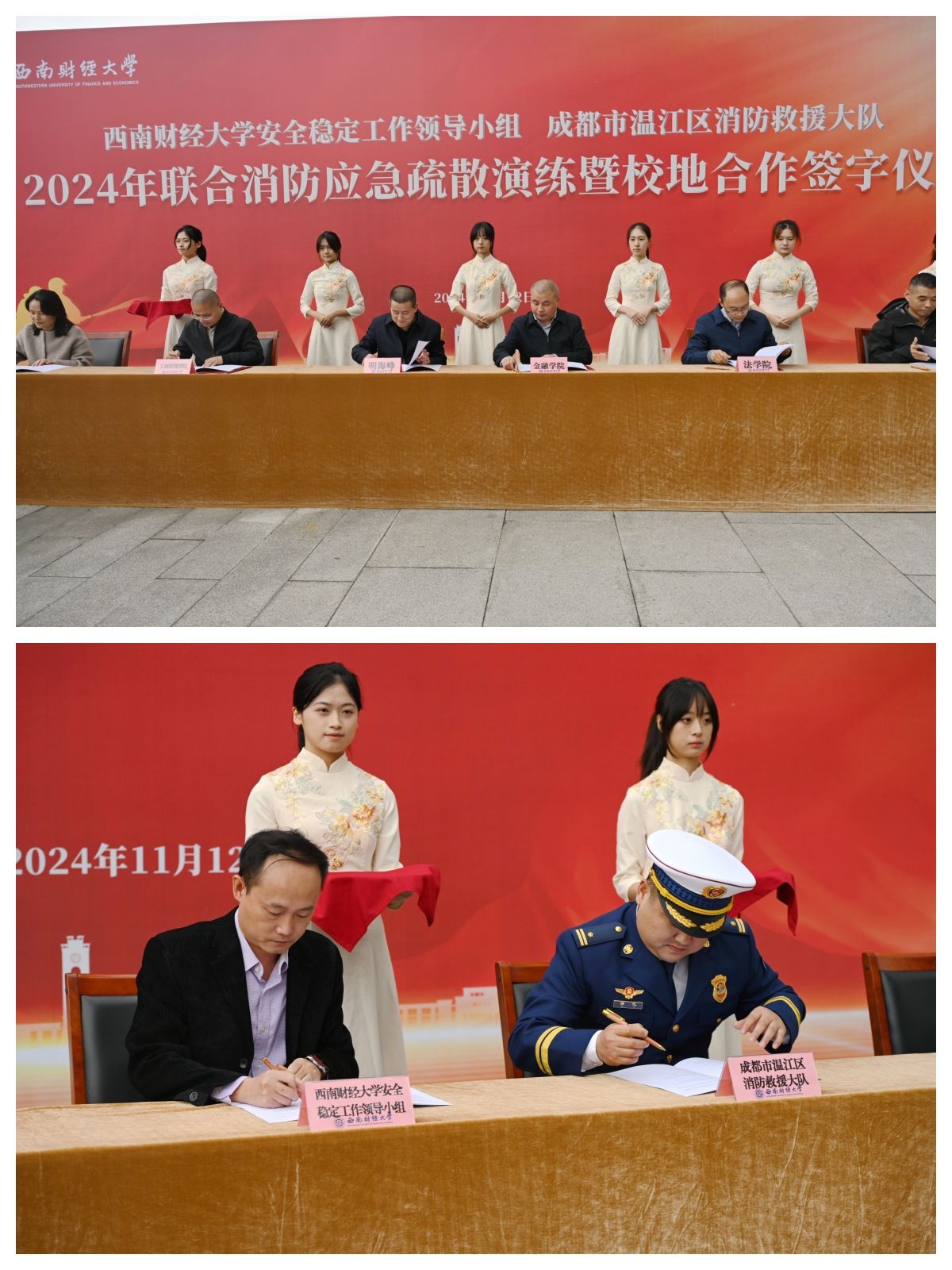 11月12日下午,学校与温江消防救援大队2024年消防应急疏散演练暨《合作共建协议》签约仪式在柳林校区诚正楼前广场举行。党委副书记明海峰出席活动并担任演练总指挥,成都市温江区消防救援大队副大队长蒲亿,学校相关职能部门、学院(研究院)负责人和师生代表300余人参加。