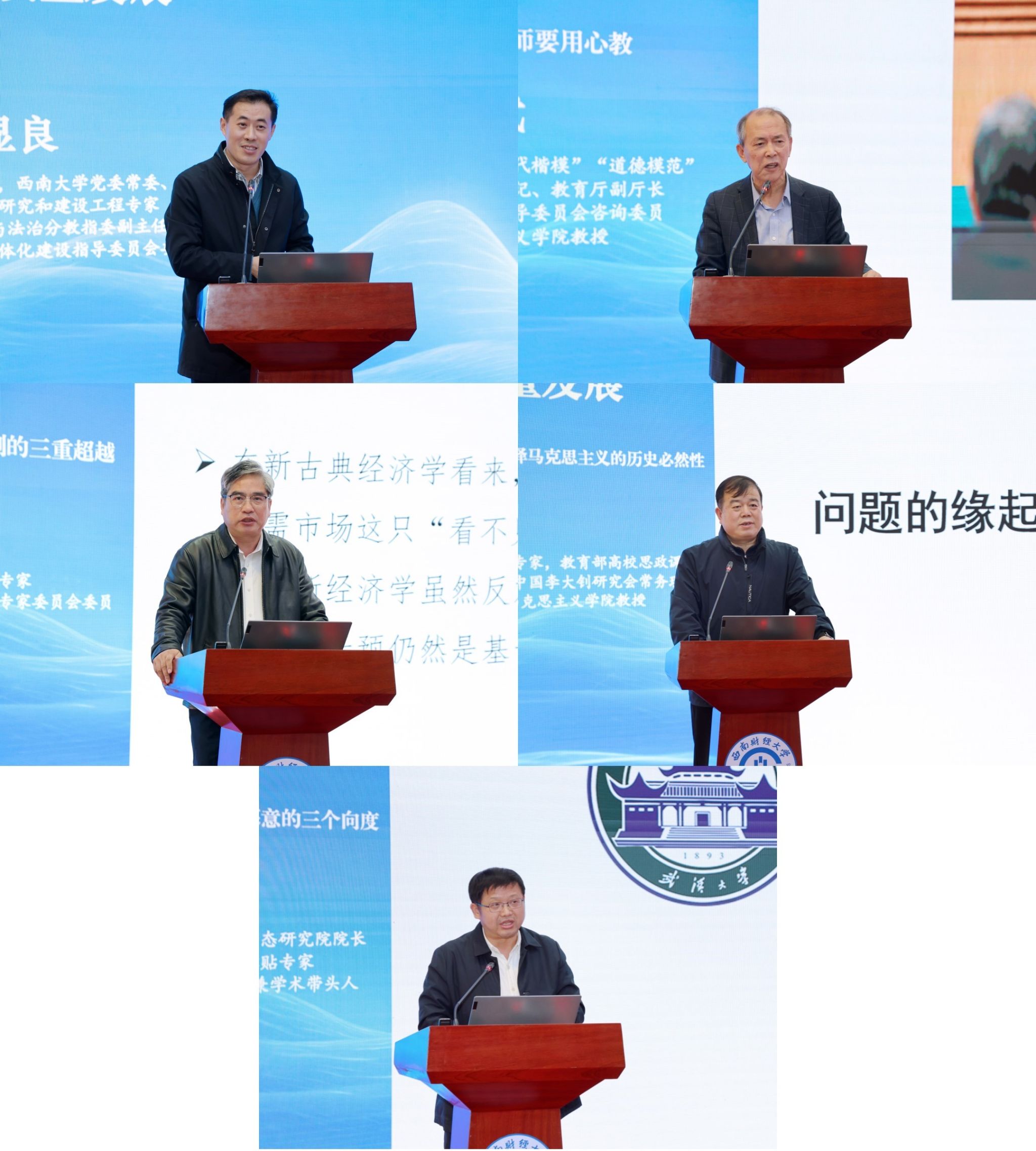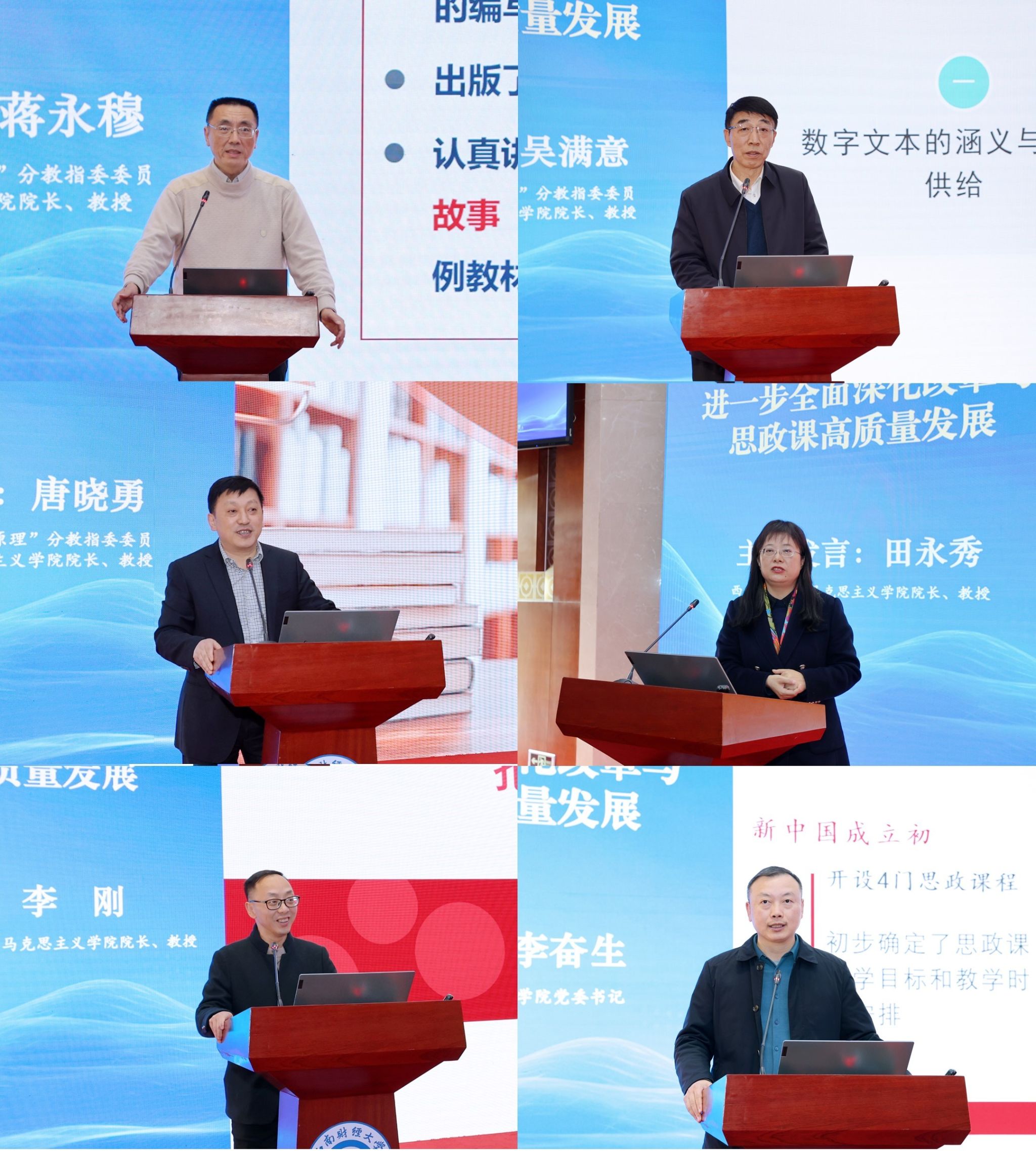 主旨发言第一环节,西南大学白显良教授、大连海事大学曲建武教授、北京大学孙来斌教授、南开大学纪亚光教授、武汉大学项久雨教授围绕进一步全面深化改革与思政课高质量发展作主旨报告。第二环节,四川大学蒋永穆教授、电子科技大学吴满意教授、西南财经大学唐晓勇教授、西南交通大学田永秀教授、四川省委党校(四川行政学院)李刚教授、成都理工大学李奋生教授围绕会议主题作主旨发言。