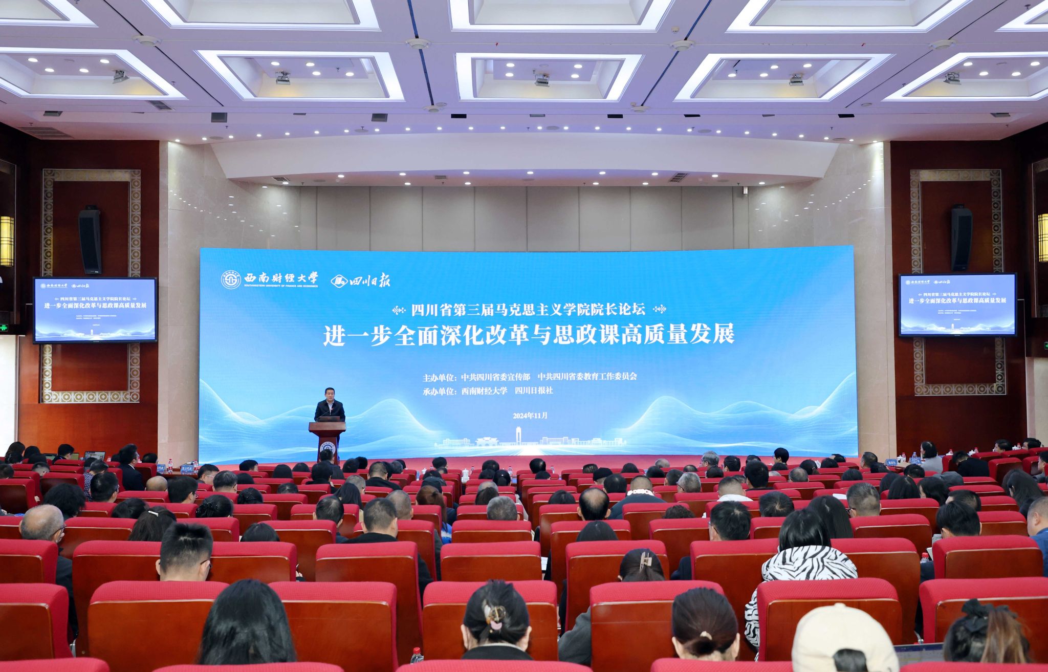 为深入贯彻落实党中央和四川省委关于加强新时代马克思主义学院建设的部署要求,11月25日,由中共四川省委宣传部、四川省委教育工委主办,西南财经大学和四川日报报业集团承办的四川省第三届马克思主义学院院长论坛在柳林校区成功举办。来自四川省内外130余所高校、党校以及社科研究机构的专家学者、马克思主义学院负责人及师生代表300余人汇聚一堂,围绕“进一步全面深化改革与思政课高质量发展”主题开展深入研讨。
